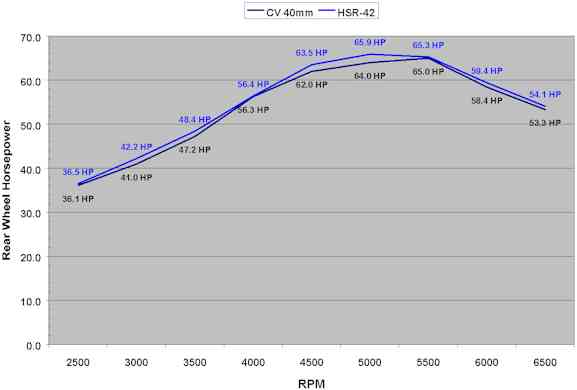 How good is the CV carburetor?Jerry Branch of Branch Flowmetrics did dyno testing of a CV carburetor against the Mikuni HSR-42. The results of this testing is shown below. The engine was a stock bike with a set of Branch #4 heads installed. Everything else on the bike was stock. The results show that a properly tuned CV carburetor makes excellent power on mildly modified engines. Considering that Branch Flowmetrics is owned by Mikuni (now), the dyno testing shows how good a CV can be. The results of an S&S carburetor would be similar to the Mikuni results. This dyno chart should convince any rider that for Stage 1 and 2 engines the OEM CV carburetor is the best bang for the buck.