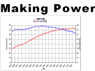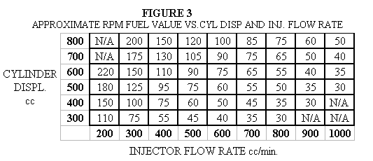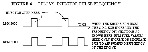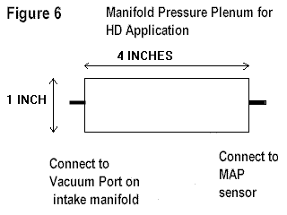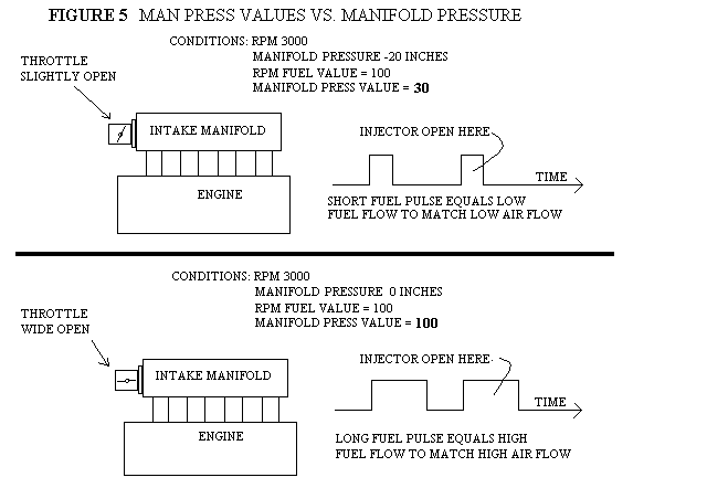 Manifold Pressure (MANIFOLD PRESS or MP) Data in the manifold pressure chart determines the relationship between vacuum and boost and the amount of fuel injected. Standard EM-3 systems have a negative sign preceding all vacuum numbers in inches of mercury, all boost numbers are in psi and have no sign in front of them. All units are pre-programmed with a standard MAP value chart depending on the MAP sensor used. These values should be close, so most initial programming is usually done on the rpm values. MAP values should increase roughly proportionally as MAP increases. If the engine appears to be too rich everywhere, lower the RPM FUEL values across the board. Do not start re-sloping the MAP values as this often leads to people getting way off track. Since idle mixture is difficult to pre-program, the user will almost certainly have to adjust the values in this manifold pressure range. Most V-twin engines will idle between 10 and 15 inches of vacuum, so this is where the idle adjustments will be made. Idle MAP values work best by having them in the range of 50-60. Initially, you should leave your idle MAP values as per the standard MAP chart and only adjust the RPM Fuel values to obtain a smooth idle. Select gauge mode to get an idea of what manifold pressure your engine is idling at. Select the closest range to this MAP by using the parameter select buttons on the LCD programmer. If the mixture knob is to the left of 12 o'clock at idle, the mixture is too rich so the value in the window will have to be reduced by hitting the -1 or -10 buttons until the knob can be advanced to the 12 o'clock position. Use caution at high throttle openings with severe stumbles. You can melt the pistons if the mixture is too lean. Always go richer first with the knob to see if the stumble gets worse. Return the knob to the 12 o'clock position before working on the next range. MAP values should increase in a reasonably linear fashion. They should not go up by one or two per location then suddenly increase by 5 or 8 per location, except possibly at idle. If you wish to shut the fuel off during deceleration, this can be accomplished by entering 1's at the low vacuum numbers as seen in the example map. You cannot do this on TP systems. There are 3 different MAP sensors used with the system which cover a different range of pressures. The slope of the values will be different with different sensors. If the idle speed is fluctuating up and down, move to the manifold pressure ranges just above and below where the engine is idling at. Make slight adjustments here until the idle is smooth. Idle MAP values often work best when the values are the same over the whole range of idle MAP ranges (2-3 ranges). If the MAP fluctuates over more than 3 ranges at idle and you cannot get a smooth idle, you may have to install a .0185 to .025 inch orifice in the MAP sensor line. Refer to figure 5 if you do not understand the MAP concept. ![]() For setting cruise and higher power MAP values, the same procedure as above applies. Set the programmer to Gauge 1 mode and increase MAP with the throttle until you identify a rich or lean spot either with the mixture knob or mixture meter. For example let's assume that at -8.42 to -6.81 inches we have a slight stumble and the mixture meter reads very lean. We continue to hold the throttle steady within this range while watching gauge 1 mode. Now, we turn the mixture knob richer until the stumble is no longer evident. The knob is turned to around +12% to make the engine run smooth. Now, we can go into the manifold pressure values to the ranges spanning -8.42 to -6.81.We can bump these up from say 90 to around 100 to see if we have made them rich enough. Remember to turn the knob back to its 12 o'clock or 0% position to verify your change. This will have to be repeated at all MAP sites where the mixture is not right. When programming, remember to change only one variable at a time. To hold MAP constant, use a high gear and the brake or a hill to keep rpm from changing as you open the throttle. Make the change then go back to gauge, reestablish the range that you were working on and check the mixture again. When using the mixture meter, most engines have to idle quite rich to be smooth. Under light load cruising conditions, most engines can be run quite lean for good fuel economy. Under full throttle and boost conditions, the mixture needs to be quite rich to produce maximum power and suppress detonation. It is normal for the mixture meter to go full lean when the throttle is released while in gear if 1's are entered in the high vacuum areas of the MAP ranges. Throttle Position (TP or Throttle pos) This section applies only to systems not using a MAP sensor. The TPS must be adjusted properly to supply correct data to the ECU. To do this, first select gauge mode on the programmer. In the top, left corner TP will appear followed by a 2 digit number between 0 and 64. These numbers refer to throttle plate position. With the throttle closed, rotate the sensor until a number between 4 and 8 appears behind TP. The TPS should be tightened down at this point. Each number or position will have a corresponding value number beside it between 0 and 255, This value number determines the amount of fuel injected at that throttle position. Once the engine is started, the value number corresponding to the closed throttle position should be increased if the mixture knob is to the left of 12 o'clock or decreased if the knob is to the right of 12 o'clock. The aim is for smooth running with the knob in the straight up position. Values only have to be entered for the position numbers from closed to open throttle. TP values should increase rapidly in the first 10 -20 numbers then slowly flatten out towards full throttle. Idle TP values should be in the 25-35 range. TP values multiplied by the RPM values result in the primary pulse width so the more air being admitted by the throttle plates, the higher the correspond
