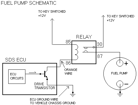 Fuel lines should be at least 8mm (5/16 in.) ID for engines up to 200 hp and 10mm (3/8 in.) for engines over 200 hp. The fuel injection pump must be adequate to supply full rated fuel flow at maximum design pressure for a given output. As a rule of thumb, on gasoline, you will require about 5.7cc per minute per hp so a 150 hp engine would burn about 855cc per minute. (150 X 5.7). On alcohol, double these figures. Injectors must also be capable of flowing adequate amounts. Total fuel flow divided by the number of injectors fitted will give you the minimum flow rate needed from each injector. We recommend running injectors to only 85% duty cycle. So, on a 2 cylinder engine with 150 hp, we would calculate 855 divided by 2 = 428. 428 divided by .85 = 504. An injector flowing at least 500cc per minute should be used for this application. If you already know the injector flow rate, you can calculate the maximum safe hp available with the following formula: injector flow rate in cc's per minute multiplied by the number of injectors divided by 7 equals maximum hp at 85% duty cycle. Using the above example, 500 X 2 divided by 7 = 143 hp. New fuel lines may be run using rigid steel, copper or aluminum tubing. Flexible lines must be medium pressure hose intended for fuel injected applications. Working pressures can exceed 60 psi on an engine. Fuel pressure regulators vary the fuel pressure according to manifold pressure. Fuel pressure at idle on most engines should be 2 to 2.7 Bar (30 to 40 psi on most engines. Wide open fuel pressure on naturally aspirated engines should be 2.3 to 3.0 Bar (35 to 45 psi). Fuel pressure on turbocharged engines should be around 2.5 Bar (35 psi) plus boost pressure. Excess fuel not burned by the engine is returned through the regulator back to the fuel tank. System Hookup and Mounting Connect each component according to the schematic below. Most separate wires are marked and those with Weatherpack plugs are self-evident with regards to connection. Separate wire connections are as follows: Green to negative coil terminal. Keep the green wire as far as possible from ignition wires. Red to battery positive or switched 12 volt source. If hooked to ignition switch, be sure that there is power in the circuit when the key is in the start position. Black wire on main harness to chassis ground. There is a second black ground wire on the white plastic connector. Both must be well grounded to the chassis. Red wire(s) on injector harness to switched 12 volts positive. Grey wire to O2 sensor if used. Optional orange wire to fuel pump relay. Optional brown wire to fast idle relay. Optional purple wire to RPM SWITCH relay. ![]() A 1 amp fuse should be placed in line with the ECU red power wire. Note if ECU power is obtained directly from the battery, a switch should be placed in line to prevent the battery from being run down over time. Ensure that all connections to ground have proper metal to metal contact. All wiring connections on the bike should be supported in such a way as to prevent vibration from working directly on the wires, sensors and connector plugs. Tie wraps should be used for this purpose. Never run wires through jagged holes unless a grommet is used. Keep all wires and especially the green tach wire as far from the ignition components and hot points as possible. ECU Mounting The ECU must be mounted in a moisture free location. Use the mounting tabs to secure it to the chassis. The ECU should be mounted as far away as possible from the ignition coil and wires. Temperature Sensor Mounting The standard CHT uses 1/4 NP threads and air temperature sensor ues 3/8 NP threads. The cylinder head temperature sensor if for warmup enrichment. This is connected to the white wire on the main harness. The air temp sensor should be placed near the intake manifold or in the induction pipes after any intercoolers which may be fitted. Air and CHT temperature sensors may be fitted to your engine using either adapter bushings into the original sensor bosses or by drilling a hole into a suitably thick area in the intake manifold for the air temp or in the cylinder head. If drilling into an area, be sure to check that the wires from the sensor will clear things exhaust pipes and that drilling will not damage anything underneath. The area should be a minimum of 5mm (.200 in.) thick and should be pilot drilled before final drilling with a 37/64 drill. Both sensors use 3/8 NP threads which are tapered threads. When tapping, be careful not to go too deep or the sensor will not tighten properly. The sensor should thread into the hole half to three quarters of the way in with mild pressure. Be sure to clean out all chips from the drilling and tapping operations before installing the sensors. Two or three wraps of teflon tape should be used on the final assembly. Sensors should be tightened until snug with a short wrench. A wire tie should always be used to secure sensor cables to prevent vibration breakages. Map Sensor Mounting The MAP sensor should be mounted in a moisture free area close to the intake manifold and connected using a length of 3mm (1/8 in.) Vacuum hose to the intake manifold DOWNSTREAM of the throttle body. Always try to mount the MAP sensor with the vacuum port facing down. The placement of a .0185 to .025 inch orifice in the vacuum hose is required on V-Twin installations to reduce MAP fluctuations Throttle Position Sensor Systems not using a MAP sensor rely on the TPS for both acceleration enrichment and load sensing. The TPS is used on ALL systems to supply accelerator pump information to the ECU. The TPS is of the potentiometer type and is of the type found on 85/99 Ford vehicles. To verify proper connections, power up the system and measure the voltage from the black to center (white) wire. The voltage should increase as the throttle is opened. In Gauge 2 mode, in the AP window you can verify proper TPS hookup by opening the throttle rapidly and watching the AP value. Th