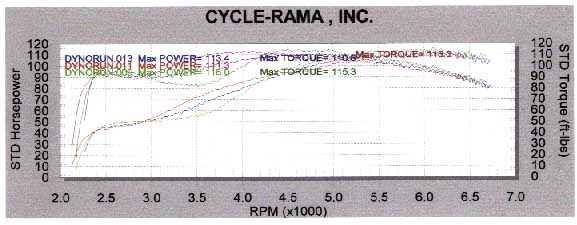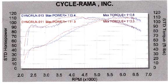 The baffled SuperTrapp makes above 100 ft.lbs. of torque between 3200 and 5700 RPMs. The SuperTrapp made better power below 4500 RPMs than the 2-2 pipes. The AR-100 makes above 100 ft.lbs. of torque between 3700 and 5800 RPMs. Above 4500 RPMs the AR-100 pipes are making 2-4 HP more than the SuperTrapp's up to the testing limits of 6500 RPMs.