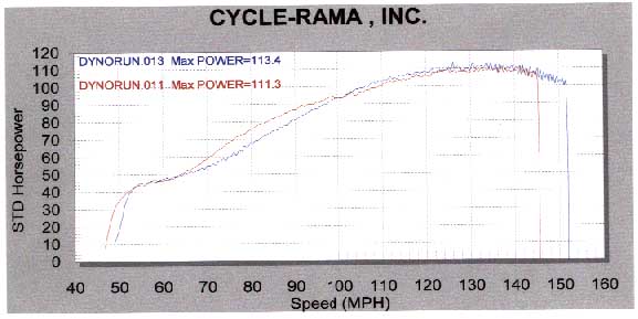 The un-baffled SuperTrapp test was conducted because past tuning efforts have resulted in the highest horsepower and torque figures from this configuration. When the pipe is run without the baffles, the power band is quite narrow and peaky. This is a good combination for drag racing, but it is deemed unsuitable for street performance. This pipe setup is also very loud, sounding more like a race bike than a street machine.